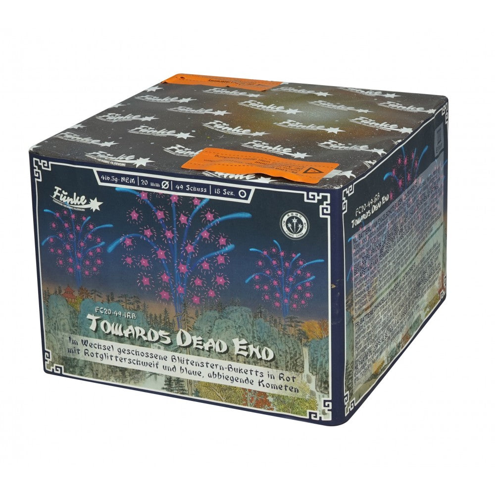 Im Wechsel geschossene Blütenstern Buketts in Rot mit Rotglitter-Schweif und blaue, abbiegende Kometen.
