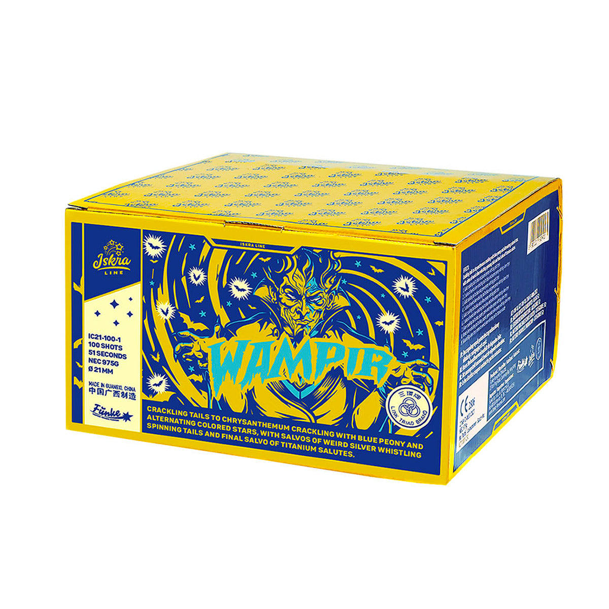 100 Schuss Verbund im Kaliber 21mm mit Crackerschweif-Aufstiegen zu Crackereffekten mit bunten Sternen. Mit Kreischwirbel-Salven und Abschlussalve aus Titansaluts.