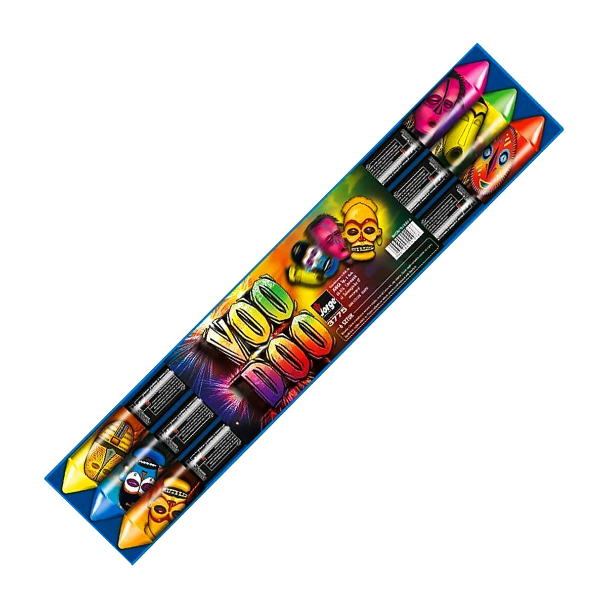 Das Voodoo Raketensortiment von Jorge Fireworks enthält sechs Silvesterraketen mit silbernem, goldenem, rotem, weißem, gelbem und Crackling Bukett.